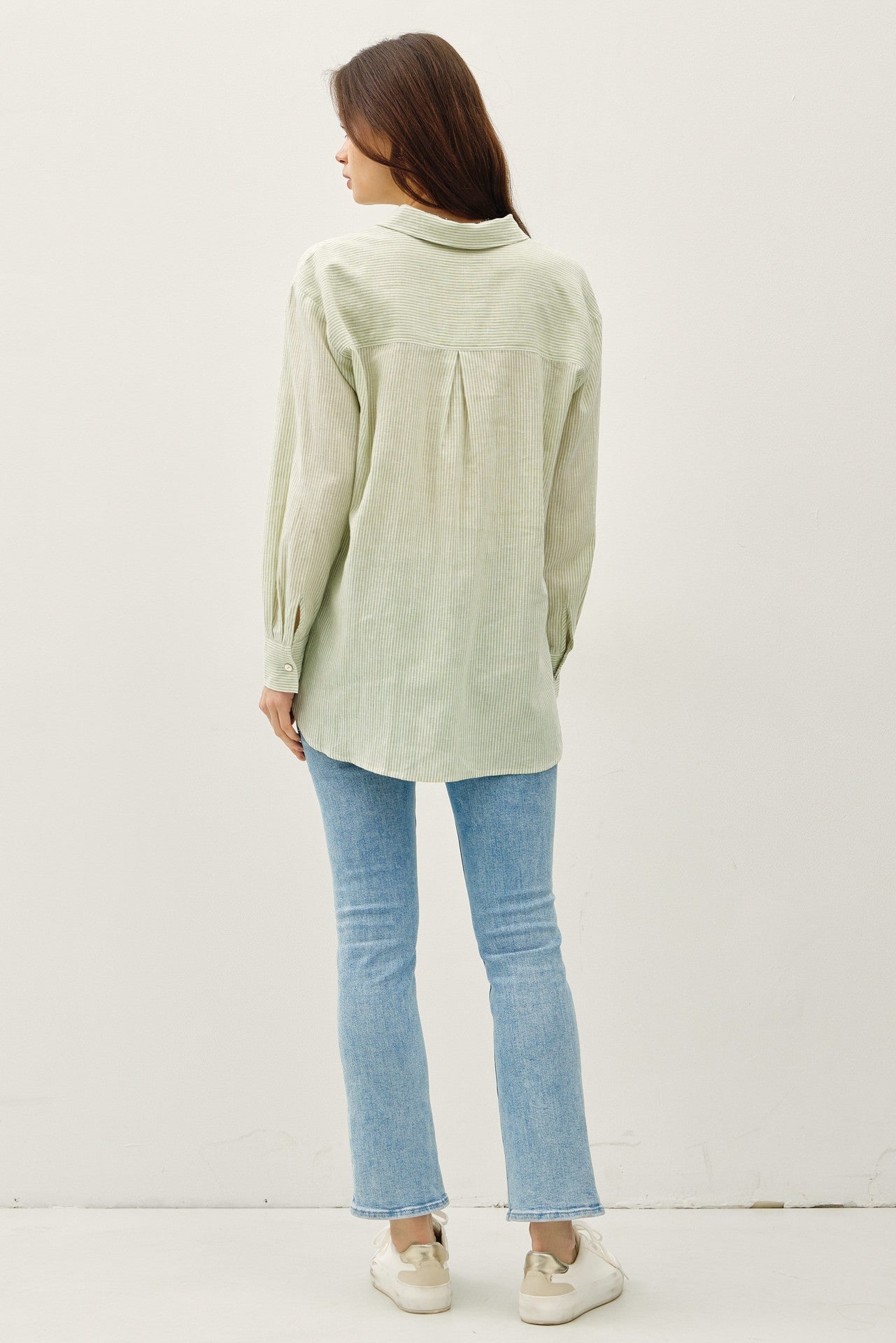 This classic cut button-up top features a sophisticated cotton and linen blend in a light green pinstripe pattern. The design includes a functional chest pocket and rounded side slit hemline for enhanced comfort and movement. The breathable fabric composition makes this versatile piece ideal for professional settings while also being a great layering piece for everyday grab and go wear.