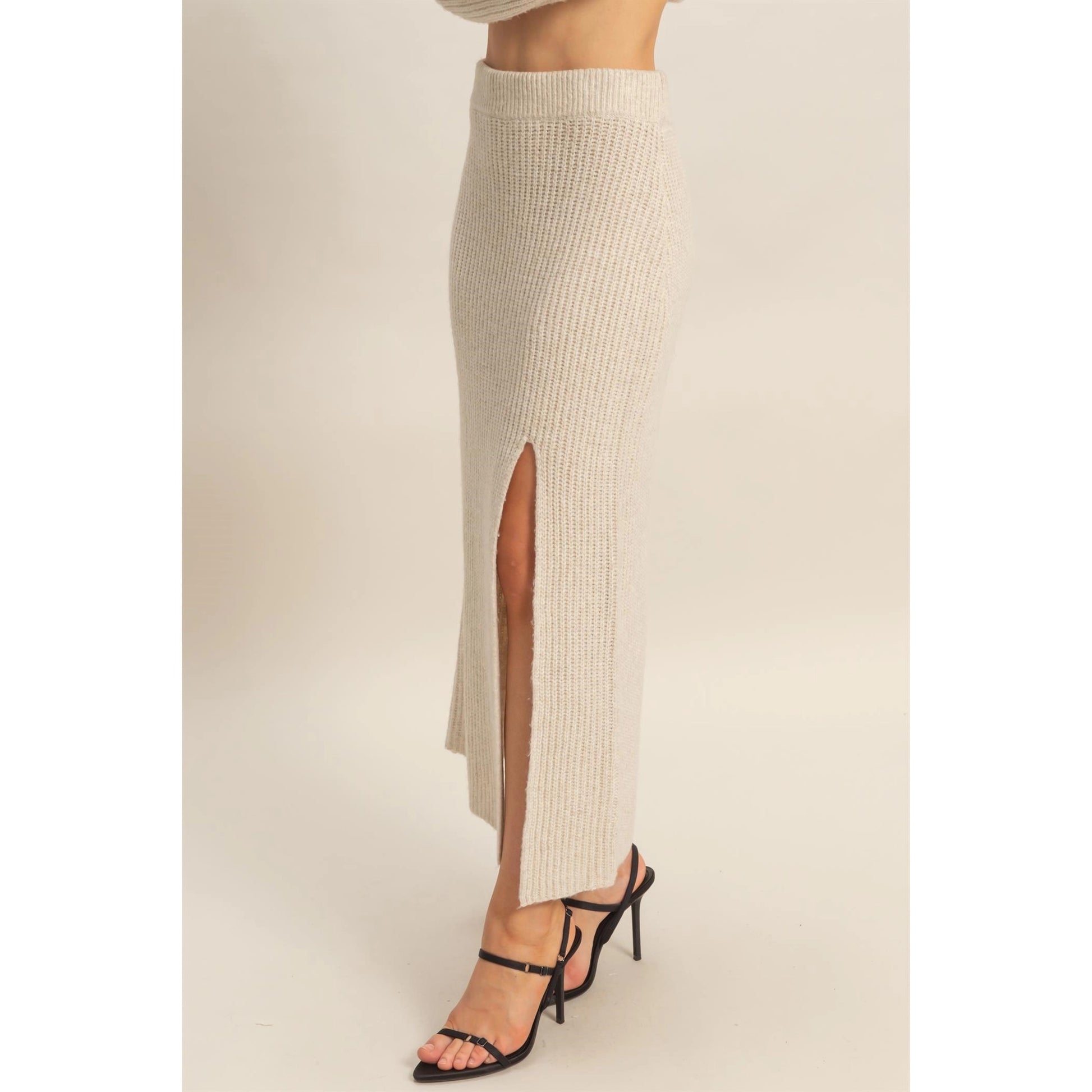 This ribbed knit sweater skirt combines understated elegance with everyday comfort. The fitted silhouette skims your frame while the side slit adds subtle movement and practicality. Crafted in soft oatmeal, this long-length piece delivers the cozy warmth of a sweater in skirt form. A versatile staple that transitions seamlessly from casual to polished occasions.